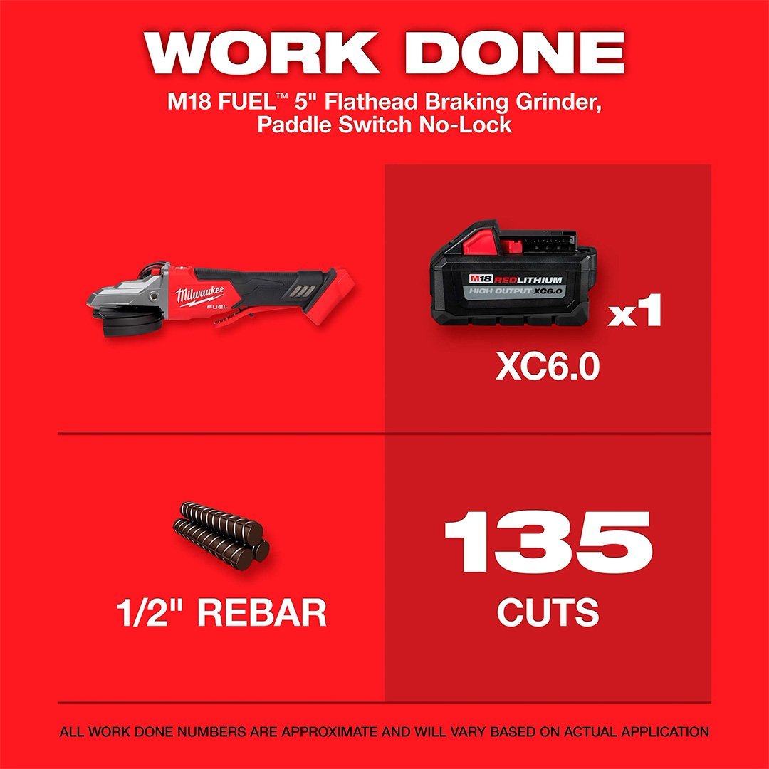 Nuestra amoladora angular de freno de cabezal plano M18 FUEL™ de 5″ con interruptor de palanca sin bloqueo es la última incorporación a la línea de amoladoras angulares inalámbricas de Milwaukee. Genera 11 A de potencia con cable, su perfil bajo facilita el acceso y el freno RAPIDSTOP™ ofrece mayor seguridad. El motor sin escobillas POWERSTATE™ alcanza 8500 RPM y la máxima potencia sostenida para completar las aplicaciones de amolado y corte más exigentes, lo que le permite usar sus amoladoras a batería con mayor intensidad y durante más tiempo que nunca. La inteligencia REDLINK PLUS™ garantiza niveles inigualables de rendimiento, protección y compatibilidad. Las baterías M18™ REDLITHIUM™ HIGH OUTPUT™ XC6.0 (no incluidas) ofrecen un 50 % más de potencia y funcionan a una temperatura un 50 % inferior a la de nuestras baterías M18™ REDLITHIUM™ XC. El diseño de cabezal plano y perfil bajo permite mayor accesibilidad a espacios reducidos. La MILWAUKEE® M18 La amoladora angular de freno de cabeza plana FUEL™ de 5″ proporciona mejor rendimiento, tiempo de funcionamiento y accesibilidad.