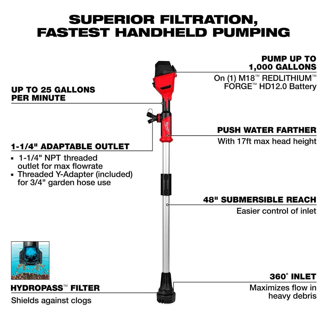 Con la bomba de transferencia de varilla sin escobillas M18™ se podrá tener una filtración superior para el bombeo manual más rápido en zanjas, bóvedas, pozos para postes de servicios públicos y más. Impulsada por nuestra plataforma de batería M18™ y tecnología de motor sin escobillas, esta bomba de agua transfiere hasta 25 galones por minuto y hasta 1000 galones con (1) batería M18™ REDLITHIUM™ FORGE™ HD12.0. Equipada con la tecnología de filtro HYDROPASS™, su filtro de 360° maximiza el flujo en residuos pesados, minimizando el tiempo de inactividad causado por obstrucciones. Con un alcance sumergible de 122 cm (48″), esta bomba de transferencia de varilla proporciona la extensión necesaria para alcanzar el agua en el fondo de zanjas y zonas de difícil acceso. Compatible con una manguera de descarga de 3,18 cm (1-1/4″) o hasta dos mangueras de jardín estándar de 1,90 cm (¾») mediante el adaptador en Y incluido, transfiere el agua a mayor distancia hasta el punto de depósito ideal con una altura máxima de descarga de 5,2 m (17 pies). Nuestra bomba de transferencia de varilla sin escobillas M18™ se une al sistema M18™ de más de 275 soluciones y es compatible con todas las baterías M18™ REDLITHIUM.