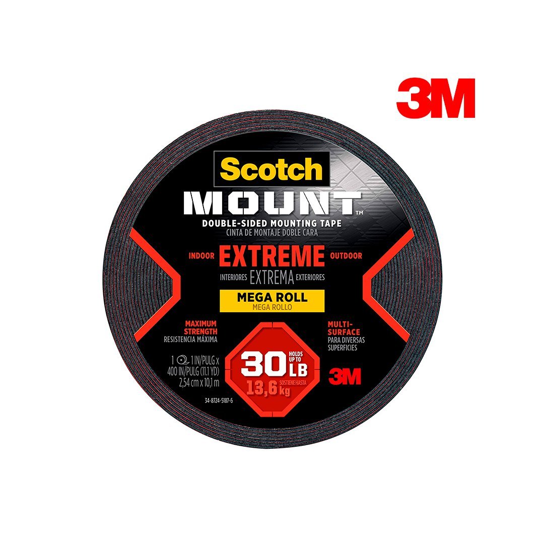 La Cinta de Montaje Doble Cara Scotch-Mount™ Extrema cuenta con adhesivo industrial 3M™. Con una capacidad de hasta 13.6 kg, esta cinta es adaptable y de máxima resistencia. Se puede usar en interiores y exteriores.