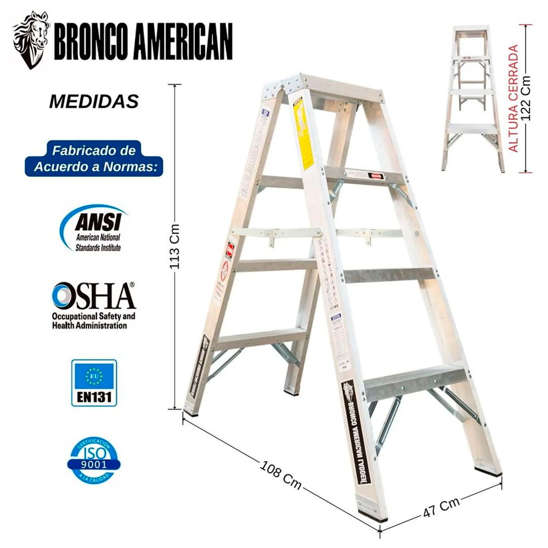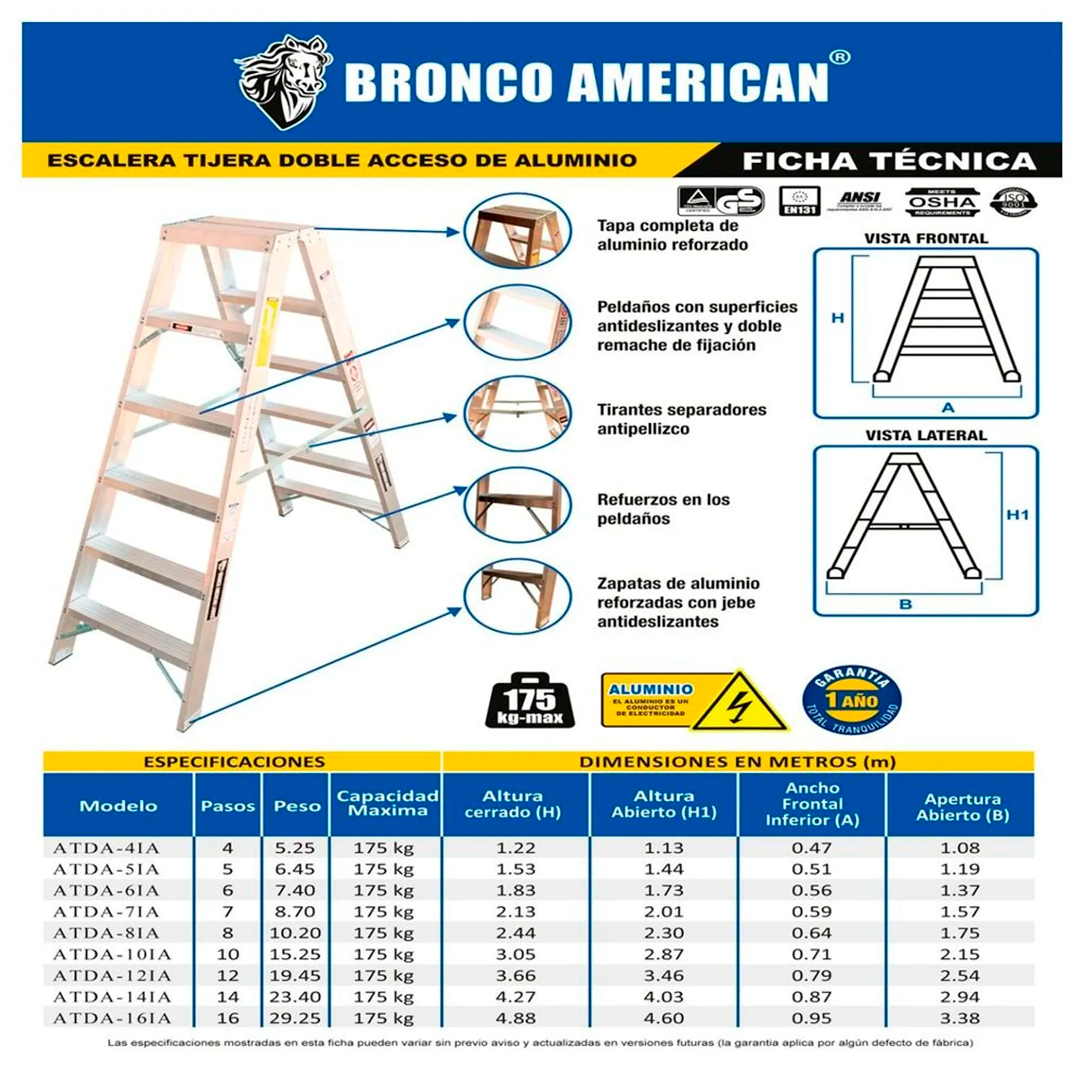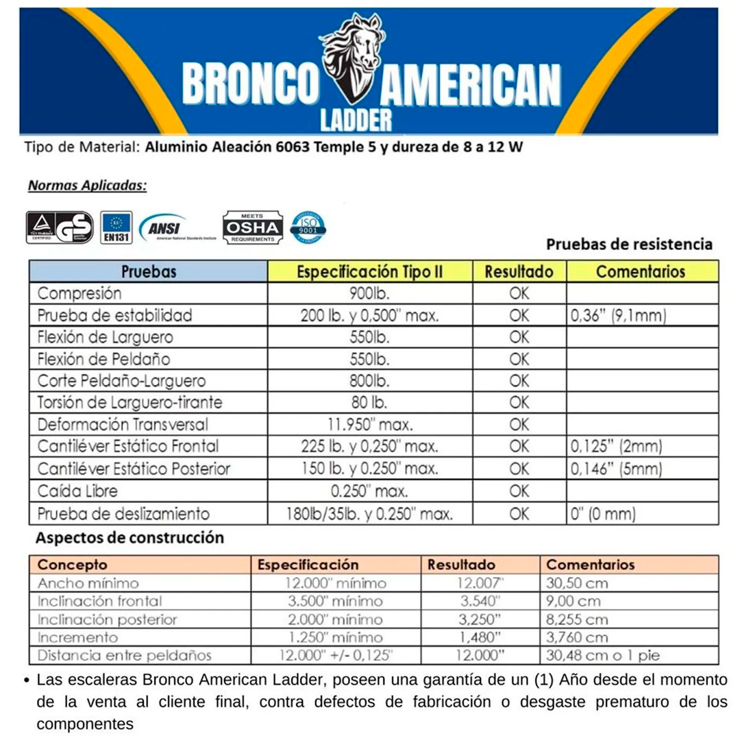 | Instrucciones uso | Apoye la escalera sobre sus zapatas en un piso firme y nivelado. Abra totalmente la escalera (Ver etiqueta adherida en el larguero de la escalera). No subir al último peldaño de la escalera. |