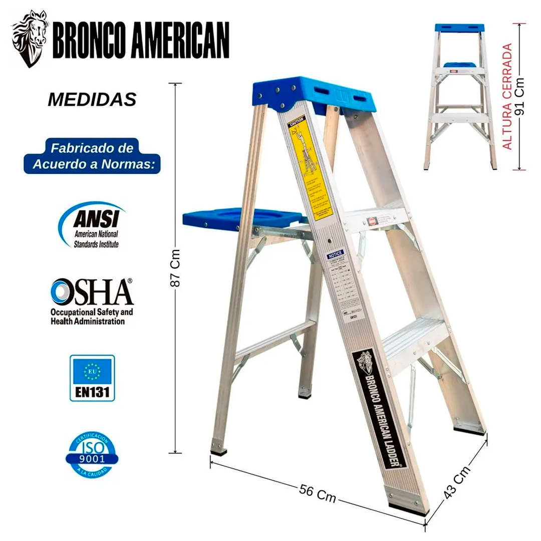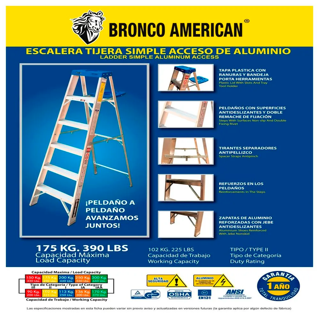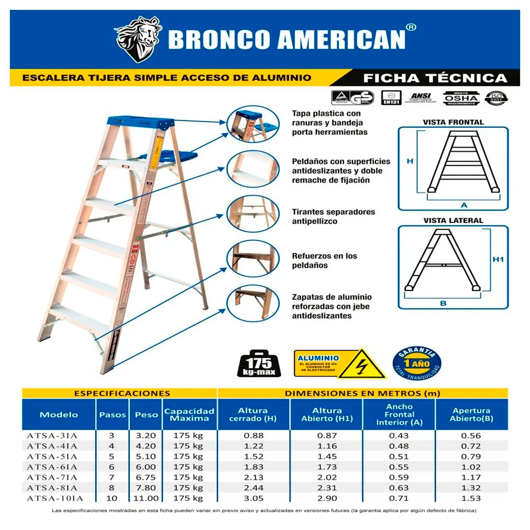| Instrucciones uso | Apoye la escalera sobre sus zapatas en un piso firme y nivelado. Abra totalmente la escalera (Ver etiqueta adherida en el larguero de la escalera). No subir al último peldaño de la escalera. |