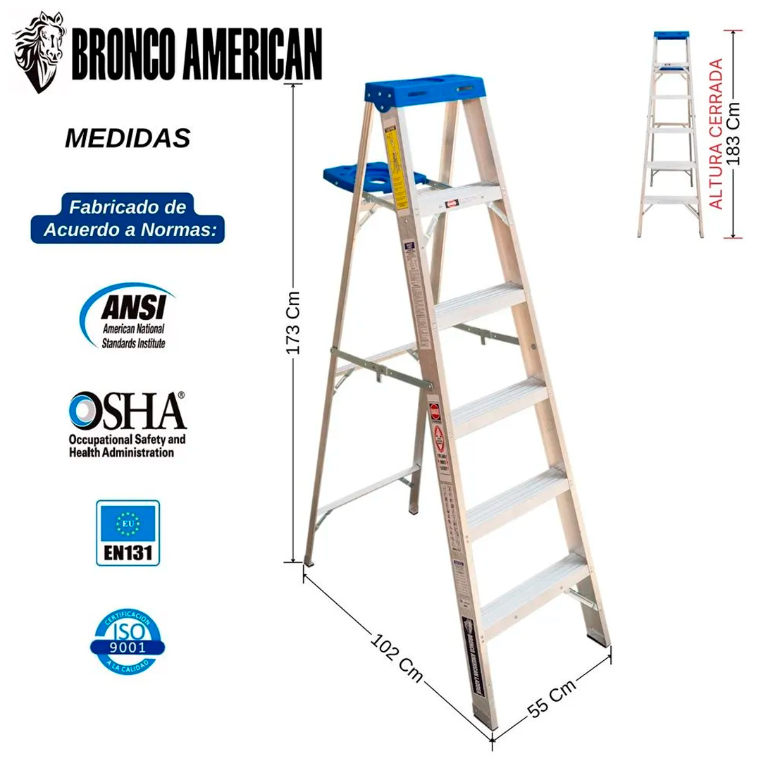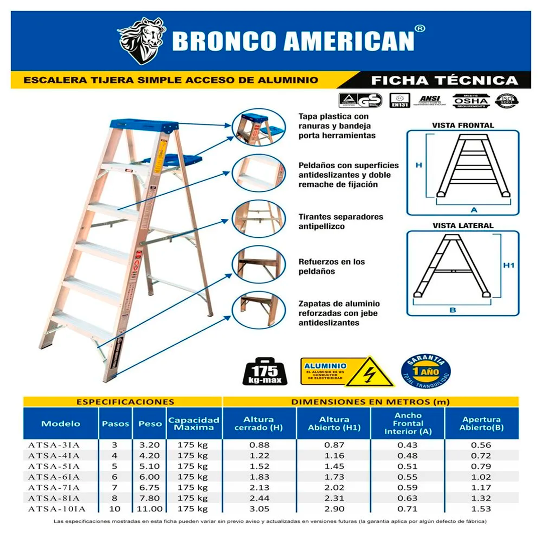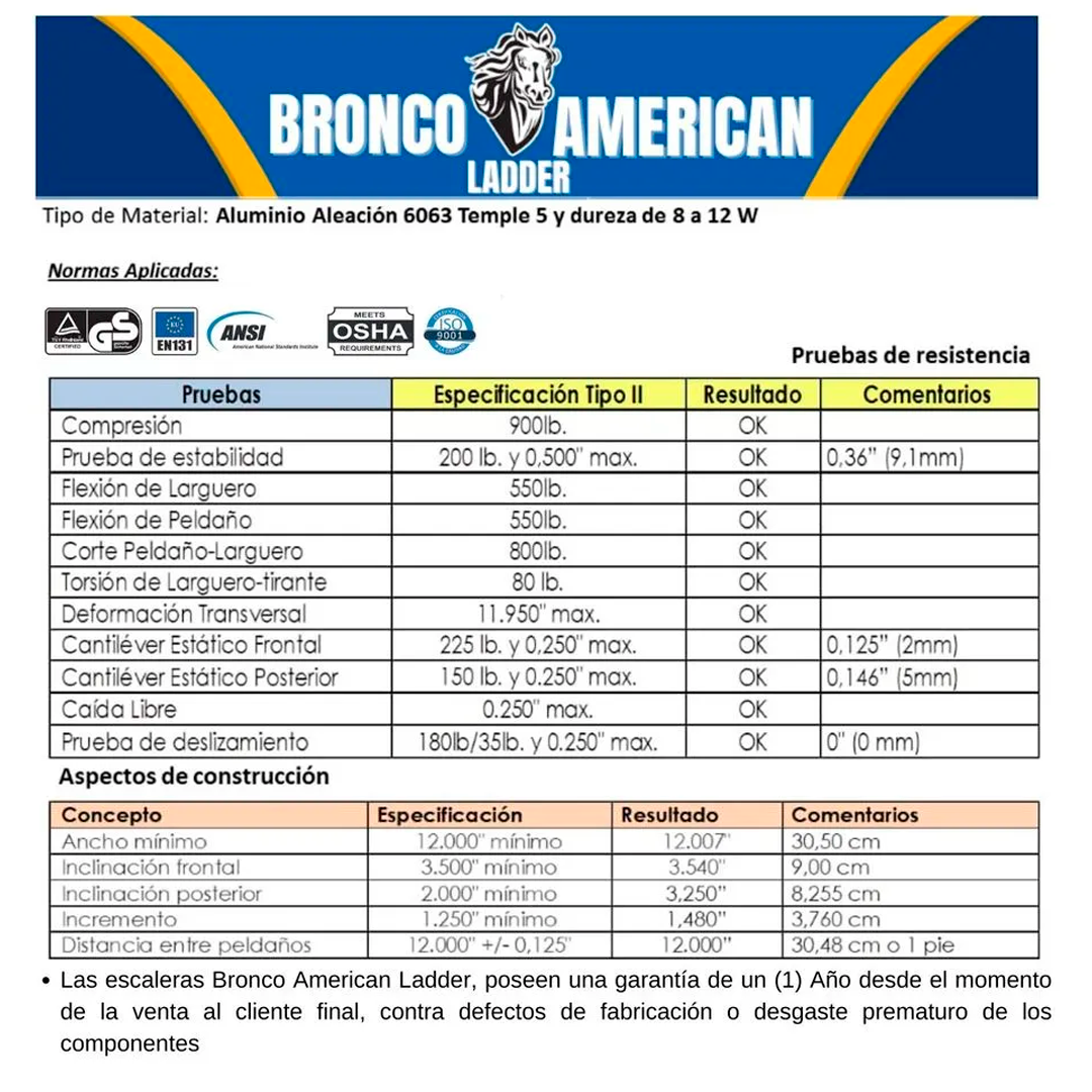 | Instrucciones uso | Apoye la escalera sobre sus zapatas en un piso firme y nivelado. Abra totalmente la escalera (Ver etiqueta adherida en el larguero de la escalera). No subir al último peldaño de la escalera. |