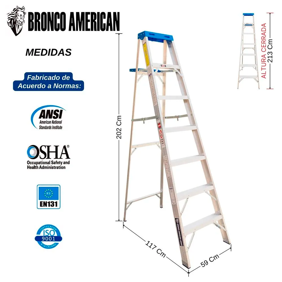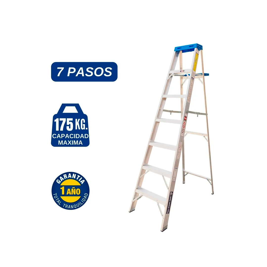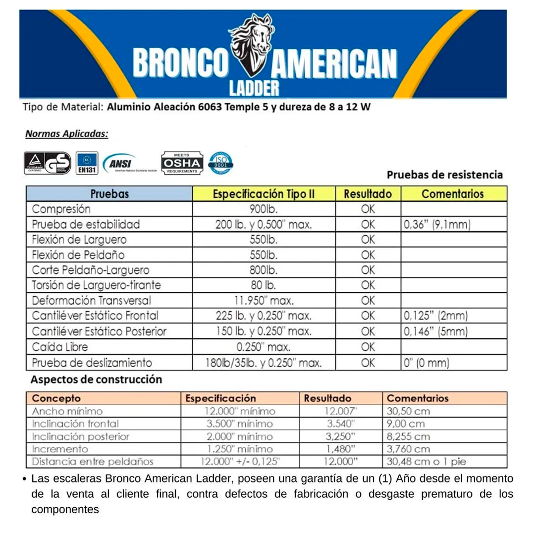 | Instrucciones uso | Apoye la escalera sobre sus zapatas en un piso firme y nivelado. Abra totalmente la escalera (Ver etiqueta adherida en el larguero de la escalera). No subir al último peldaño de la escalera. |