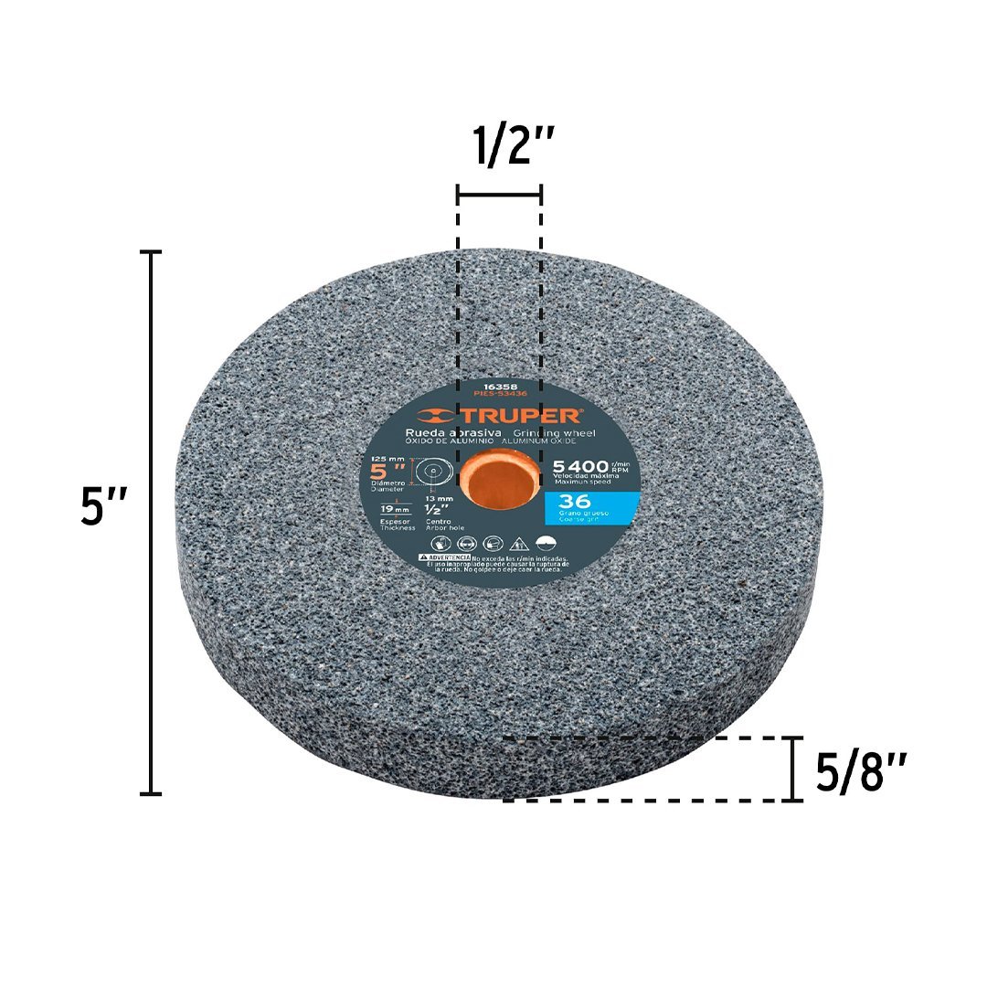 2 Ruedas abrasivas: grano 60 (mediano) y grano 36 (grueso) de 5″ x 5/8″ x 1/2″