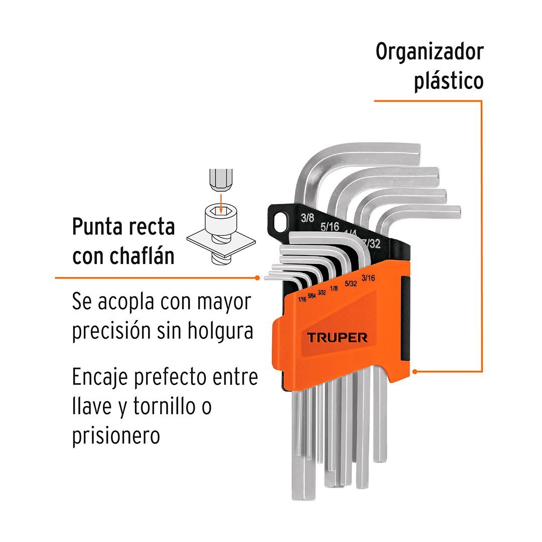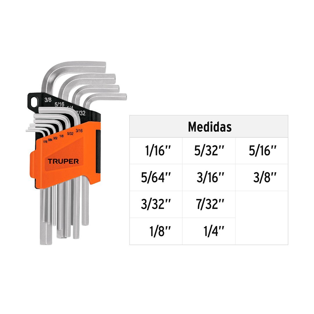 | Contenido | 10 llaves std (1/16″, 5/64″, 3/32″, 1/8″, 5/32″, 3/16″, 7/32″, 1/4″, 5/16″ y 3/8″) |