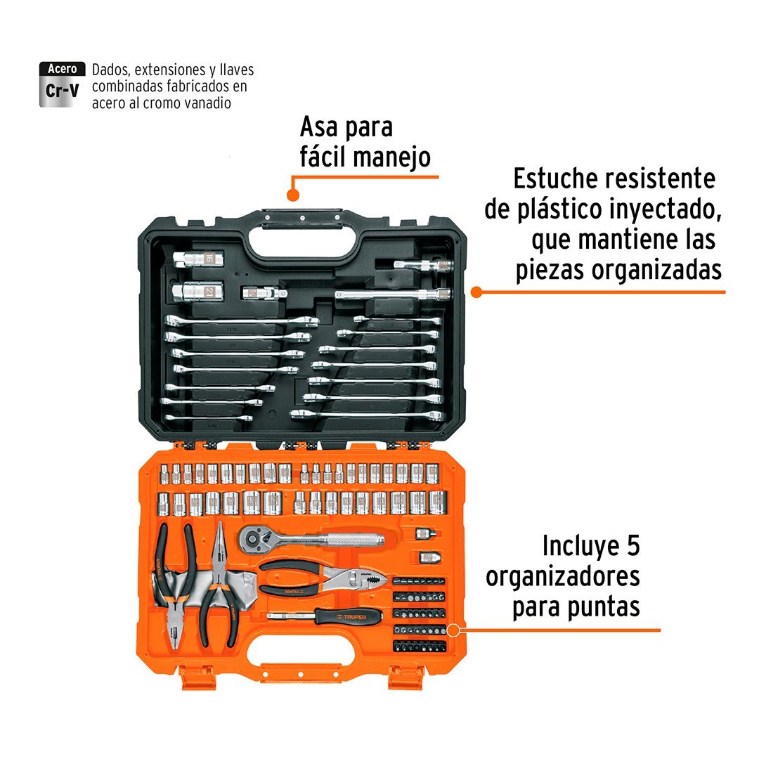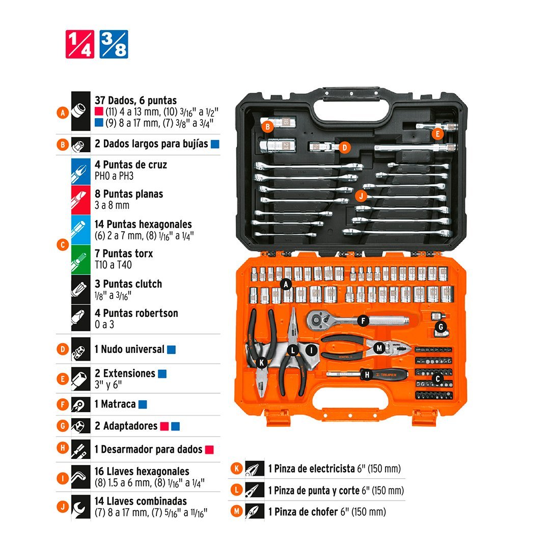 | 37 Dados: (11) 4 a 13 mm, (9) 8 a 17 mm, (10) 3/16″ a 1/2″, (7) 3/8 a 3/4″ | 2 Dados largos para bujías |