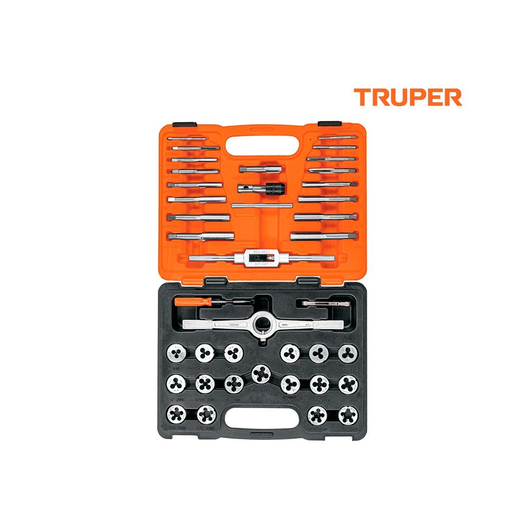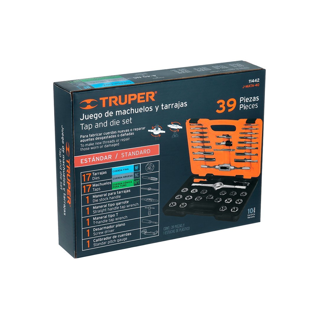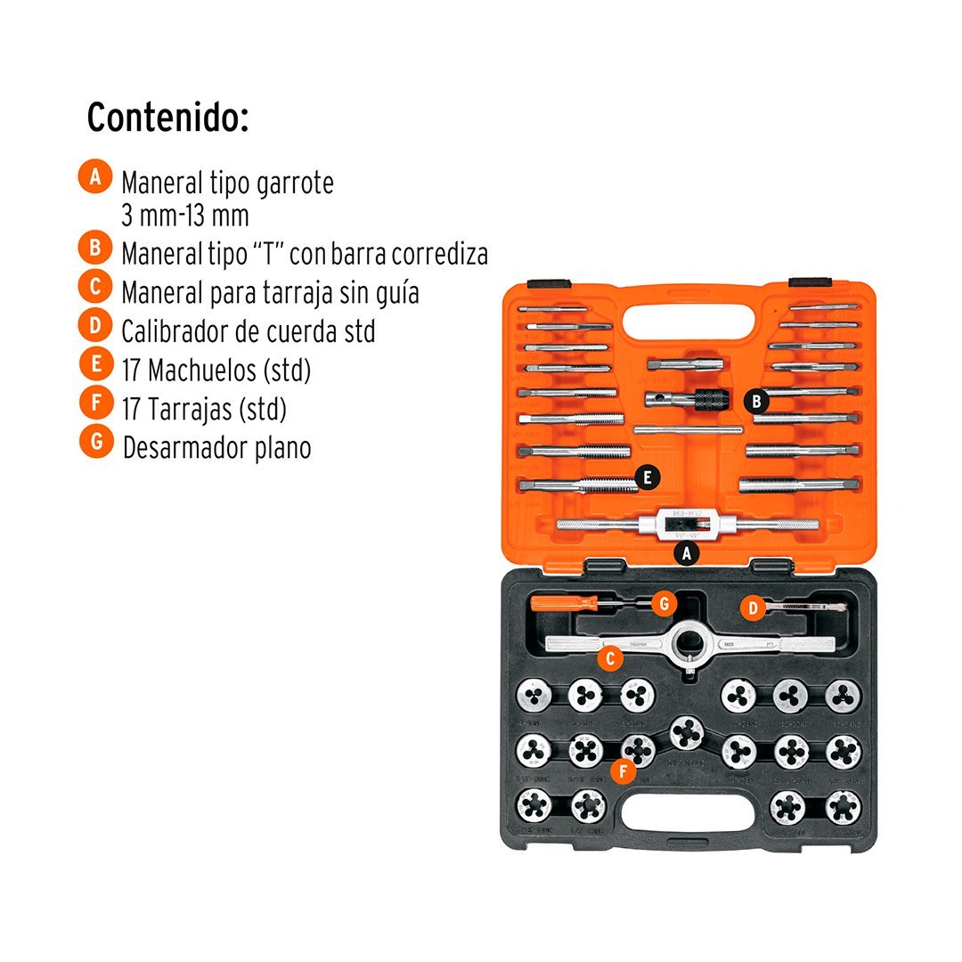 | 17 Machuelos (std y mm). Medidas: 4-40NC, 6-32NC, 8-32NC, 10-24NC, 10-32NF, 12-24NC, 1/8X27NPT, 1/4X20NC, 1/4X28NF, 5/16X18NC, 5/16X24NF, 3/8X16NC, 3/8X24NF, 7/16X14NC, 7/16X20NF, 1/2X13NC, 1/2X20NF | 17 Tarrajas (std y mm). Medidas: 1/8x27NPT, 1/4X20NC, 1/4X28NF, 5/16X18NC, 5/16X24NF, 3/8X16NC, 3/8X24NF, 7/16X14NC, 7/16X20NF, 1/2X13NC, 1/2X20NF, 4-40NC, 6-32NC, 8-32NC, 10-24NC, 10-32NCF, 12-24NC |
