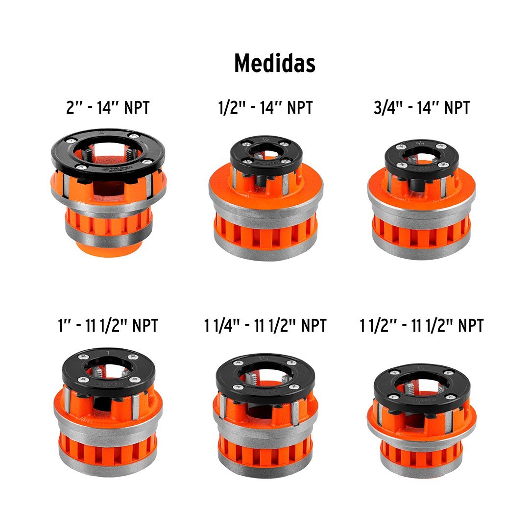 Capacidad de roscado 1/2″, 3/4″, 1″, 1 1/4″, 1 1/2″ y 2″
