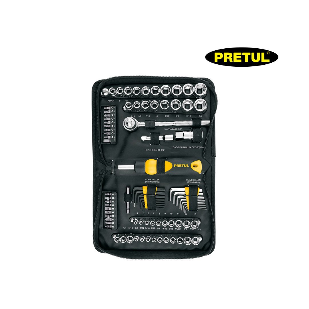 | 38 Dados 6 puntas: (10) 4 a 13 mm, (10) 5/32″ a 1/2″, (8) 5/16″ a 3/4″, (10) 9 a 19 mm | 3 Dados 8 puntas: 1/4″ a 3/8″ |