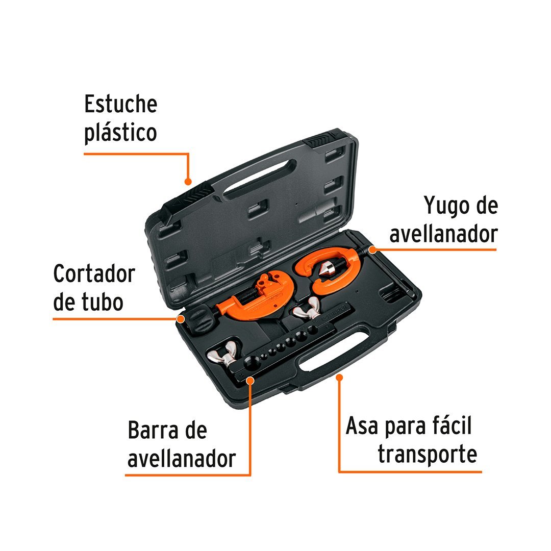 | Capacidad del avellanador | Tubos de 3/16″, 1/4″, 5/16″, 3/8″, 7/16″, 1/2″ y 5/8″ |