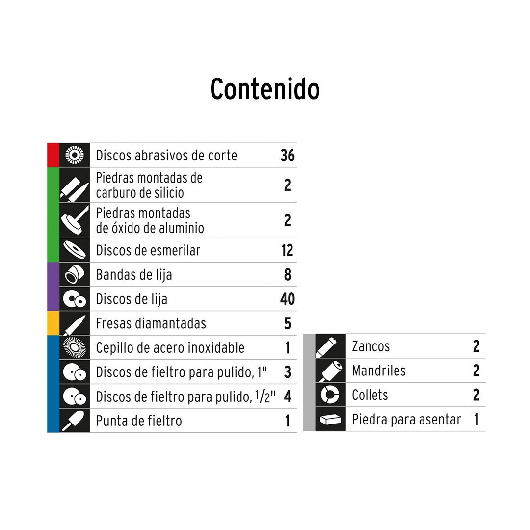| 2 Puntas montadas de óxido de aluminio | 12 Discos de esmerilar |