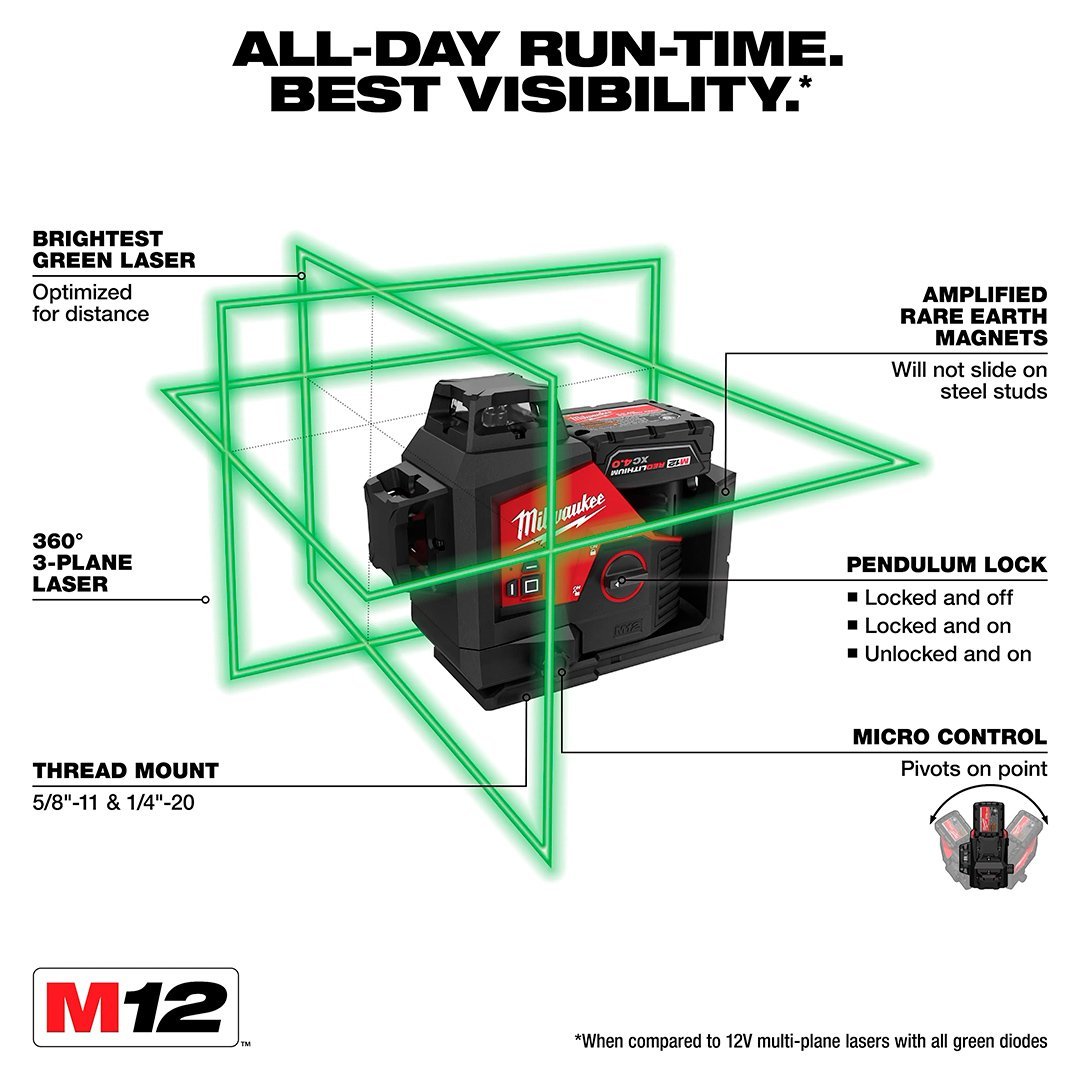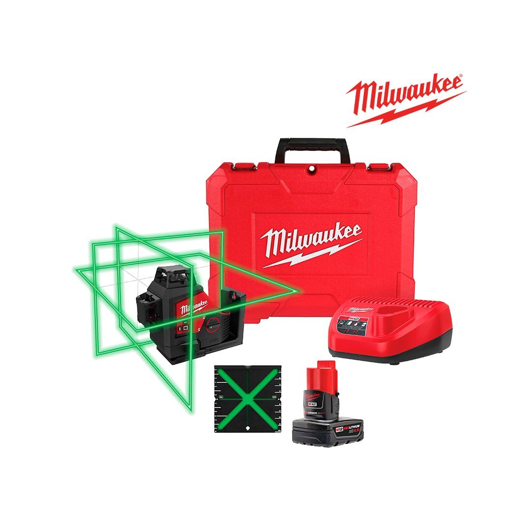 | Incluye | (1) Láser verde de 3 planos en 360° M12™ (3632-21) (1) Juego de batería M12™ REDLITHIUM™ XC 4.0 con capacidad extendida (48-11-2440) (1) Cargador de batería de iones de litio M12™ (48-59-2401) (1) Objetivo sensible de alineación de láser (48-35-1111) Maleta |