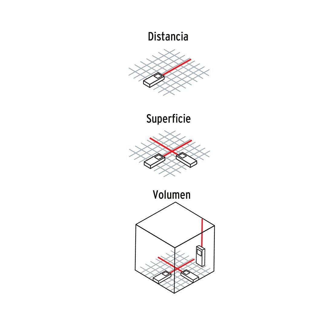 Funciones de distancia, área (4 m²) y volumen (8 m³)