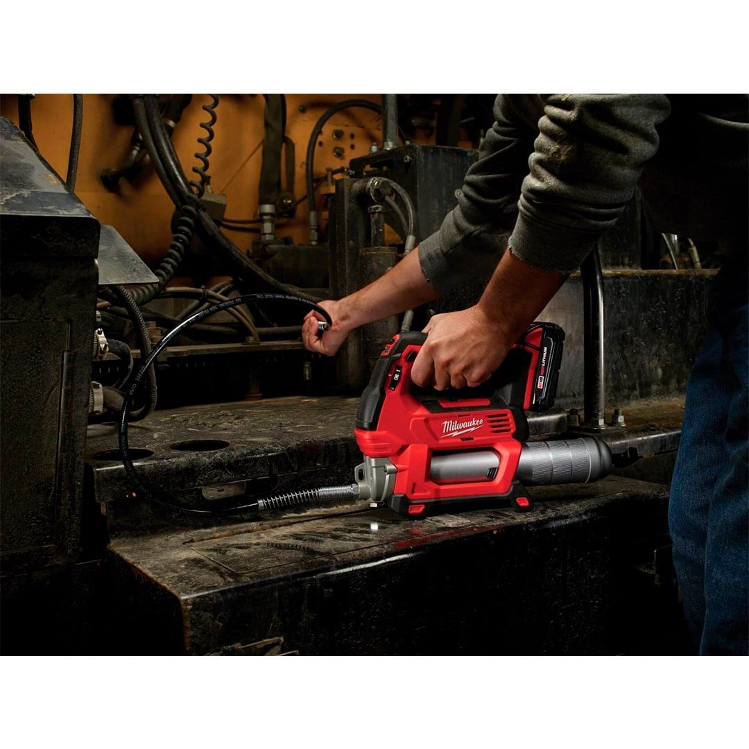 La pistola engrasadora inalámbrica M18™ de 2 velocidades ofrece máxima presión y una versatilidad inigualable, con una presión de funcionamiento máxima de 10 000 PSI, líder en la industria, y un contador de grasa preconfigurado (patente en trámite) que permite a los profesionales de servicio y mantenimiento dispensar cantidades precisas de grasa. El diseño de 2 velocidades de la herramienta permite a los usuarios seleccionar entre la presión y el caudal máximo.