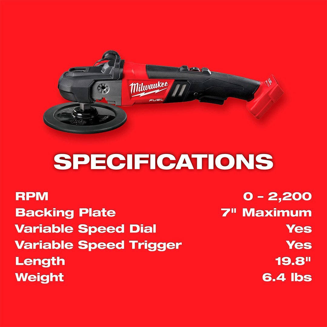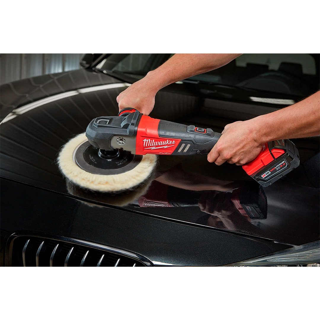 El pulidor con velocidades variables M18 FUEL™ de 7″ es el primer pulidor giratorio inalámbrico de tamaño normal del mundo. Gracias a que aprovecha la potencia, el rendimiento y el tiempo de operación de la tecnología M18 FUEL™, esta herramienta proporciona el rendimiento de una herramienta con cable que permite a los usuarios usarla en las aplicaciones más exigentes. La herramienta es más liviana que las herramientas con cable por más de 1 libra y tiene la capacidad de proporcionar un control total mediante un dial y gatillo de velocidad variable. El nuevo pulidor M18 FUEL™ libera a los usuarios del trabajo adicional, las distracciones, el daño a la pintura y los inconvenientes provocados por los cables. Junto con las baterías M18 XC5.0, el pulidor M18 FUEL™ se puede utilizar en un automóvil completo con una sola carga si trabaja con pintura buena o regular. El pulidor M18 FUEL™ cuenta con una carcasa frontal sobremoldeada de goma para evitar que la pintura se raye con el uso de la herramienta y también cuenta con una cubierta antipolvo extraíble para proteger el motor y los componentes electrónicos de las fibras de lana y los residuos. La nueva herramienta está diseñada para distribuir más su peso sobre la almohadilla, lo que proporciona una presión natural sobre la superficie y mucho más.