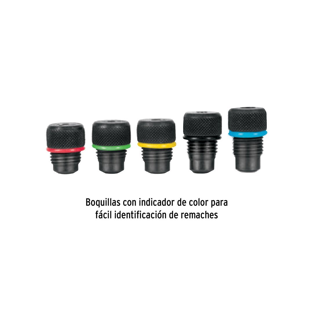 5 boquillas intercambiables con indicador de color para fácil identificación de remaches: 3/32″, 1/8″, 5/32″, 3/16″ y 1/4″