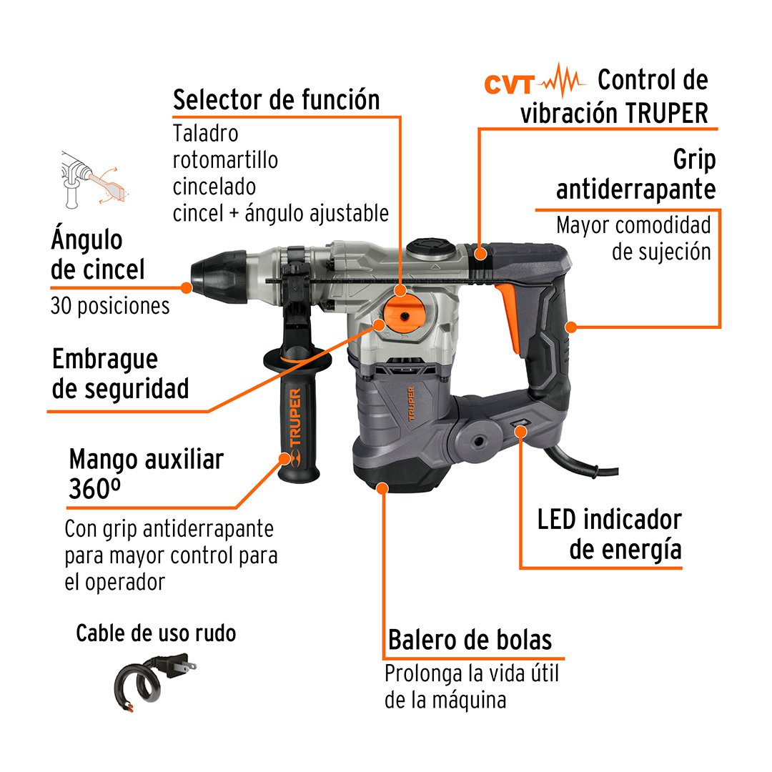 • Mango con sistema de Control de Vibración Truper (CVT) que reduce las vibraciones, haciendo el trabajo más confortable y seguro para el operador