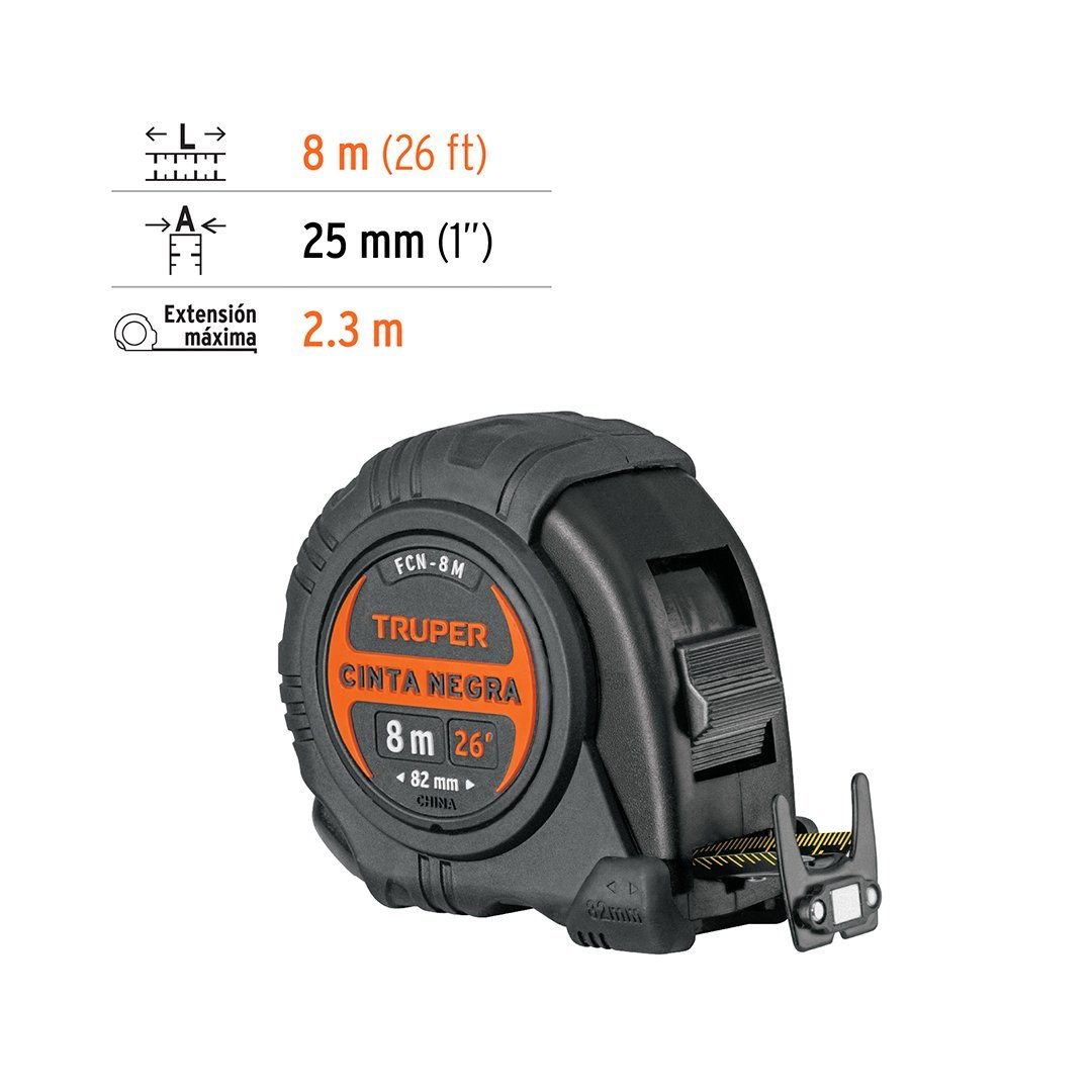Wincha cinta negra 8 m resistente a impactos TRUPER